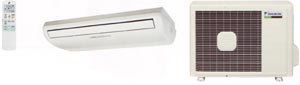 В помещениях, где необходима установка более мощного кондиционера, или в вытянутых помещениях устанавливаются кондиционеры напольно-потолочного типа, позволяющие направить сильную струю холодного воздуха вдоль стены или потолка и таким образом обеспечить равномерное распределение температуры в помещении. Внутренний блок напольно-потолочного кондиционера имеет несколько иной внешний вид и устанавливается на стене или потолке.